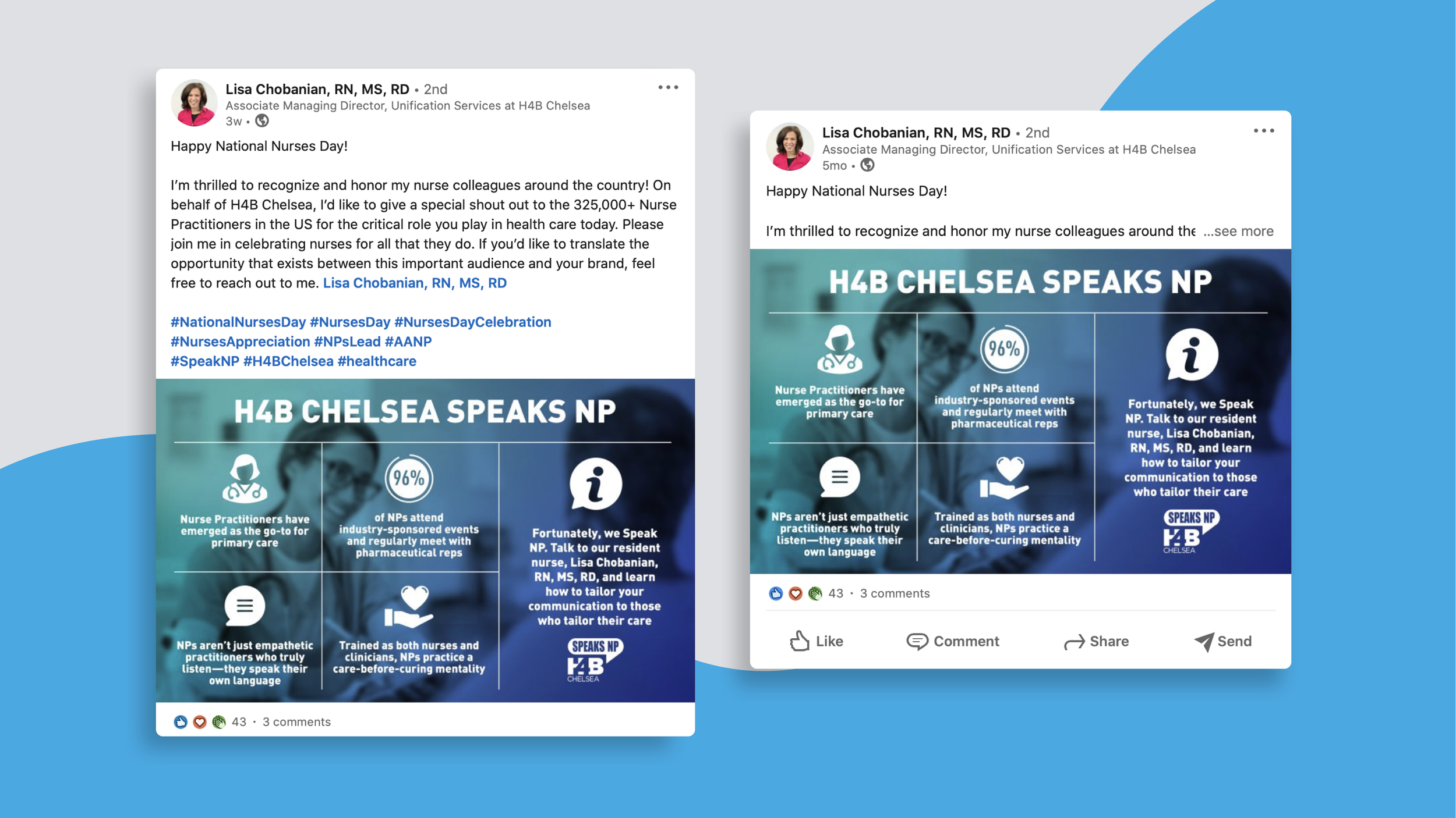 H4B Chelsea to consolidate and grow client initiatives geared towards Nurse Practitioners. Help craft the H4B Chelsea NP offering, including naming/branding and infographic to share on social media/for capes presentations. Worked closely with Chelsea's own Lisa Chobanian and copywriter to craft the right language and visuals for this initiative. Worked produced why at Havas Health and You - H4B Chelsea